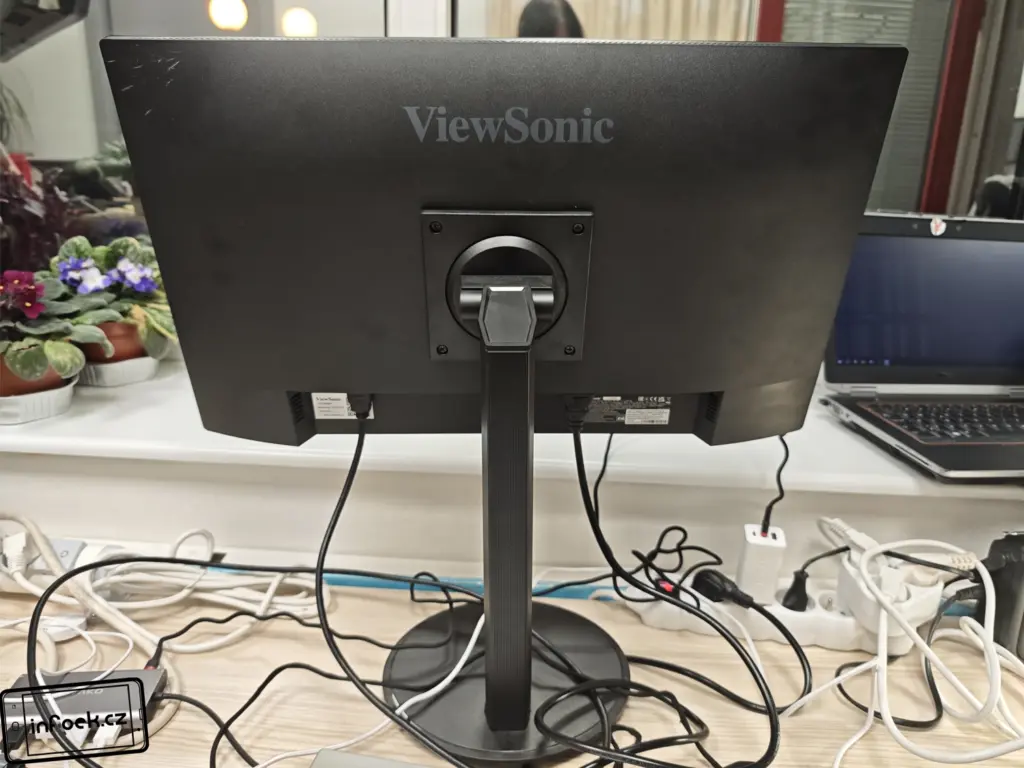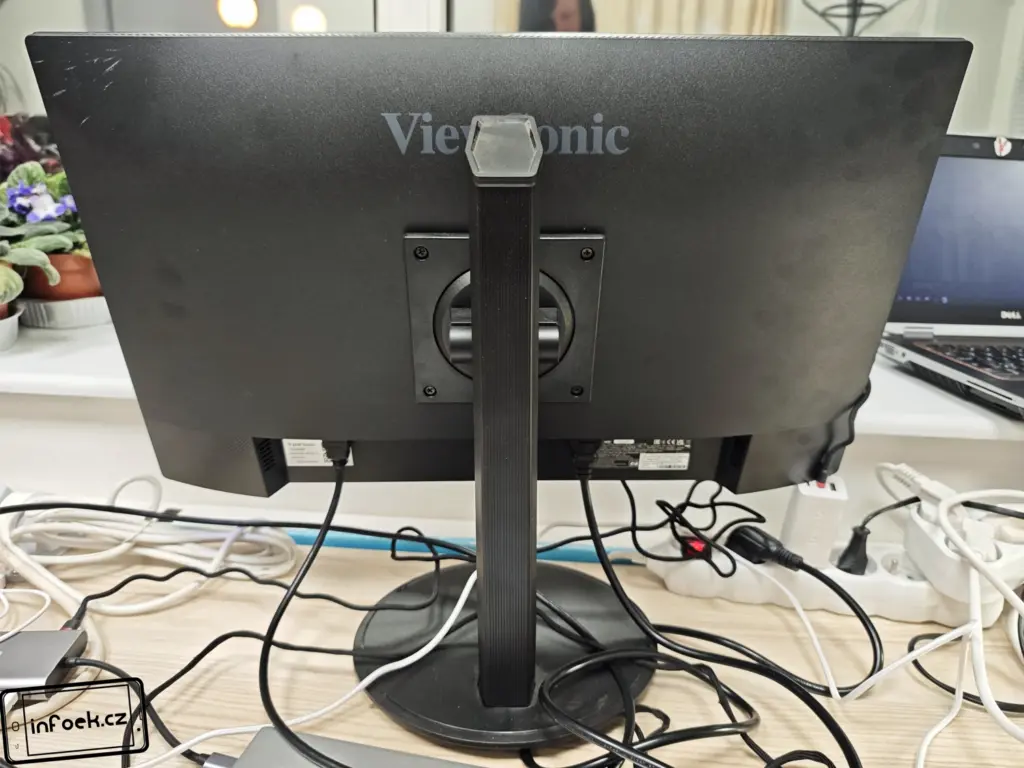 Zadní část monitoru má závity VESA (100 x 100 mm) pro uchycení stojanu z prodejního balení. Použít můžete klidně i různá ramena nebo jiná řešení. Záleží jen čistě na vašich potřebách, ale on stojan od ViewSonicu je kvalitní a po celou dobu mého dlouhodového testování jsem si ho pochvaloval. Je těžký a kovový. Díky němu můžete s monitorem pohodlně otáčet do všech stran, posouvat ho nahoru nebo dolů, naklánět na vámi požadovaný úhel a klidně ho otočit na 90 stupňů třeba pro práci s textem.
