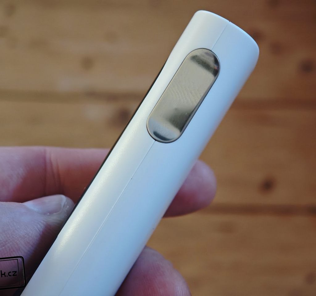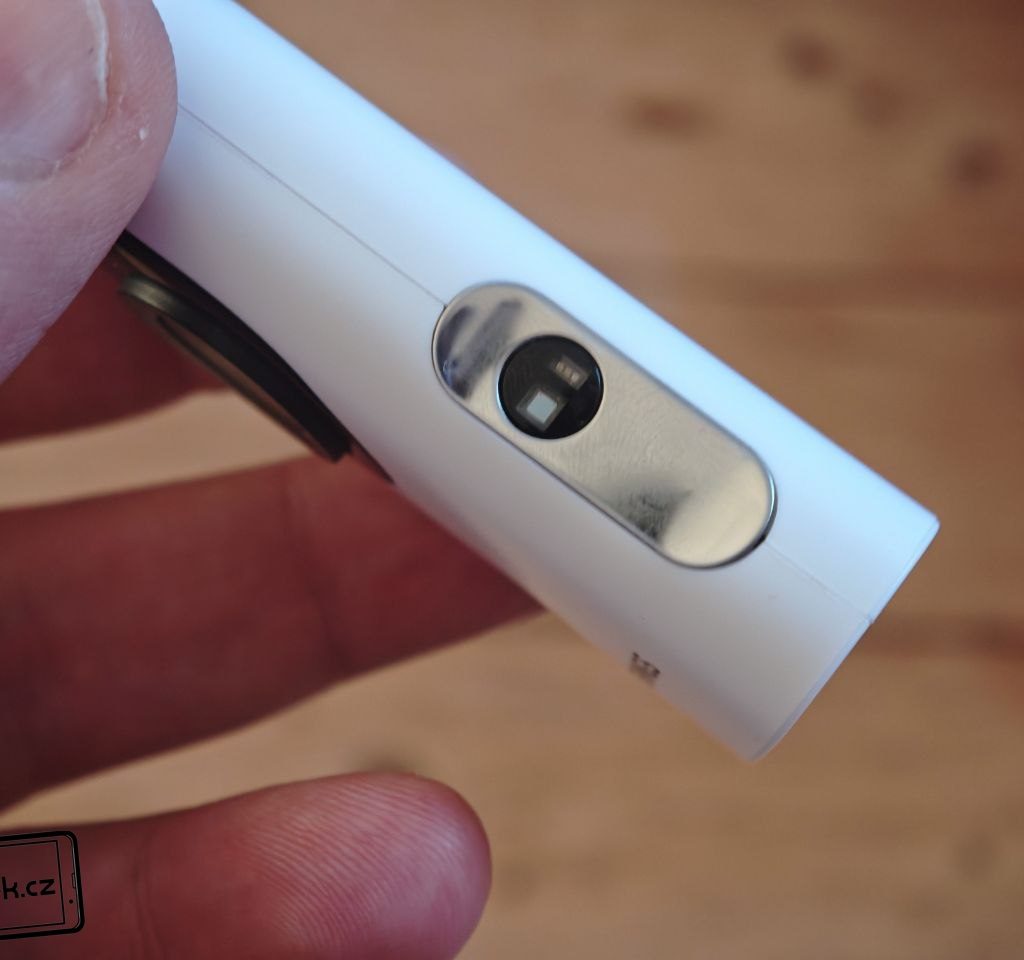 Na horní straně přístroje se nachází senzory pro měření teploty. Levá strana nabízí USB‑C konektor, který slouží nejen k nabíjení integrovaného akumulátoru. Pravá strana pak obsahuje dvě stříbrné plošky pro přiložení prstů – na jedné z nich jsou umístěny senzory pro měření srdečního tepu a okysličení krve (SpO2).