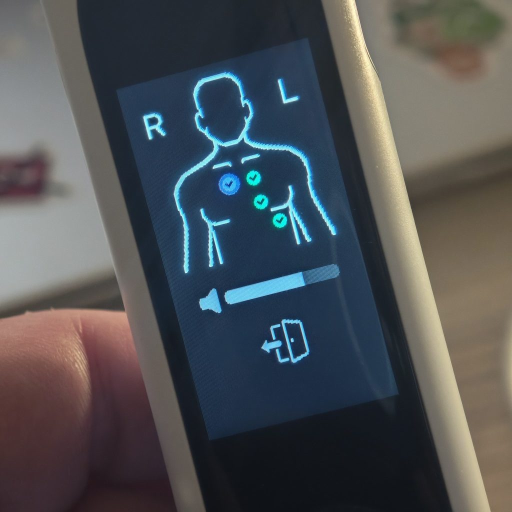 Upřímně jsem od takto kompaktního zařízení nečekal, že zvládne také měření EKG, srdečního tepu a saturace krve (SpO2). Tuto funkci jsem si oblíbil – v menu lze spustit režim ECG/SpO2, přiložit ukazováčky na dvě elektrody na pravé straně zařízení a přitlačit tak, aby kulička na displeji byla ve vyznačeném místě. Během několika sekund získáte hodnoty srdečního tepu, saturace kyslíkem i základní informaci o tom, zda je EKG v pořádku.