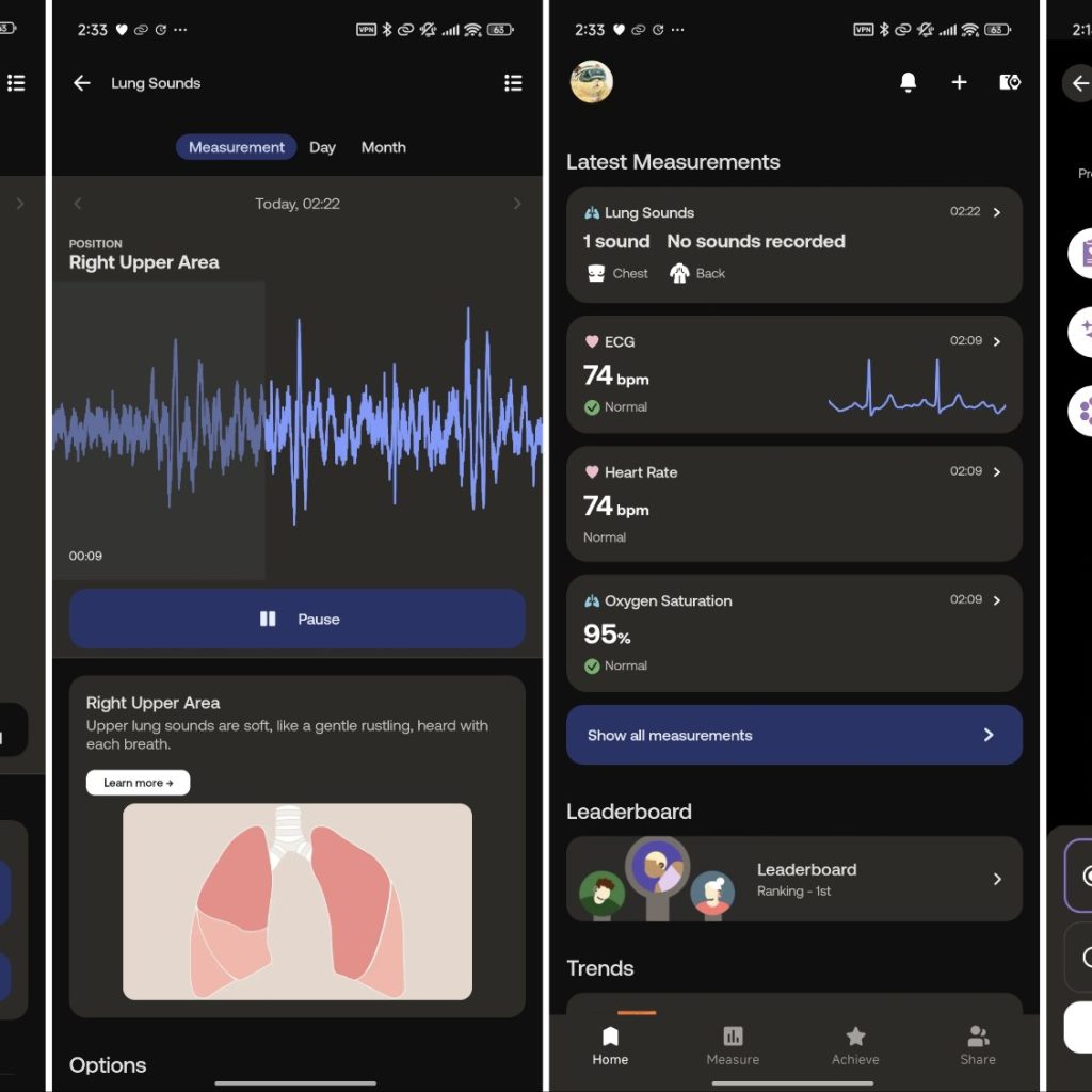 A to stále není všechno – BeamO umí fungovat i jako digitální stetoskop. Díky dodávané redukci z USB‑C na 3,5mm jack lze připojit drátová sluchátka a poslechnout si svůj dech či tlukot srdce. Sluchátka v balení nenajdete, ale postačí i levný model za pár stovek. Pokud chcete oficiální sluchátka od Withings, lze je dokoupit na webu výrobce za 14,99 €. V mobilní aplikaci si navíc můžete přehrát nahrané záznamy.