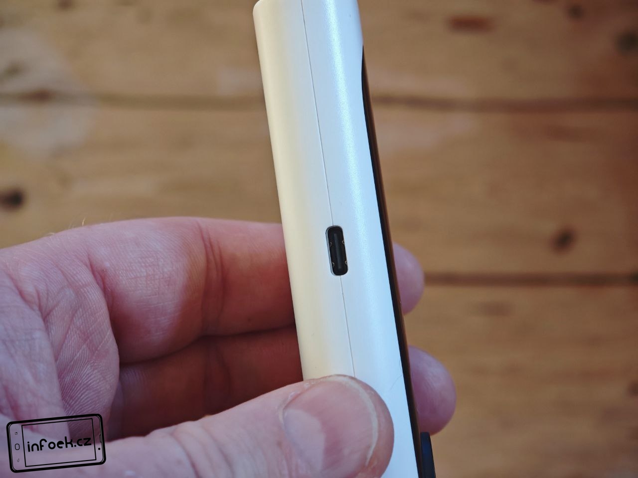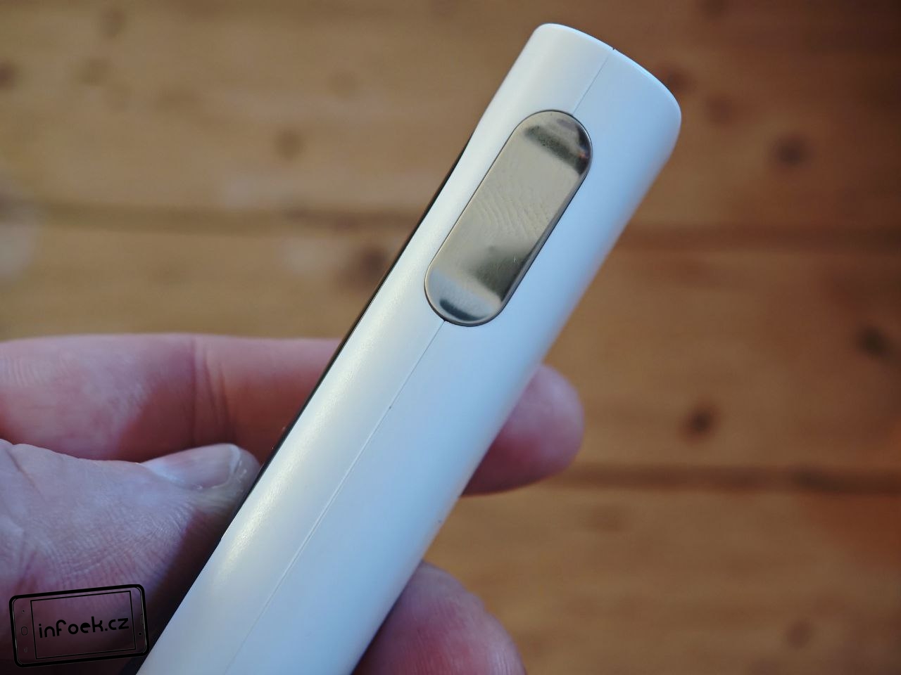 Na horní straně přístroje se nachází senzory pro měření teploty. Levá strana nabízí USB‑C konektor, který slouží nejen k nabíjení integrovaného akumulátoru. Pravá strana pak obsahuje dvě stříbrné plošky pro přiložení prstů – na jedné z nich jsou umístěny senzory pro měření srdečního tepu a okysličení krve (SpO2).