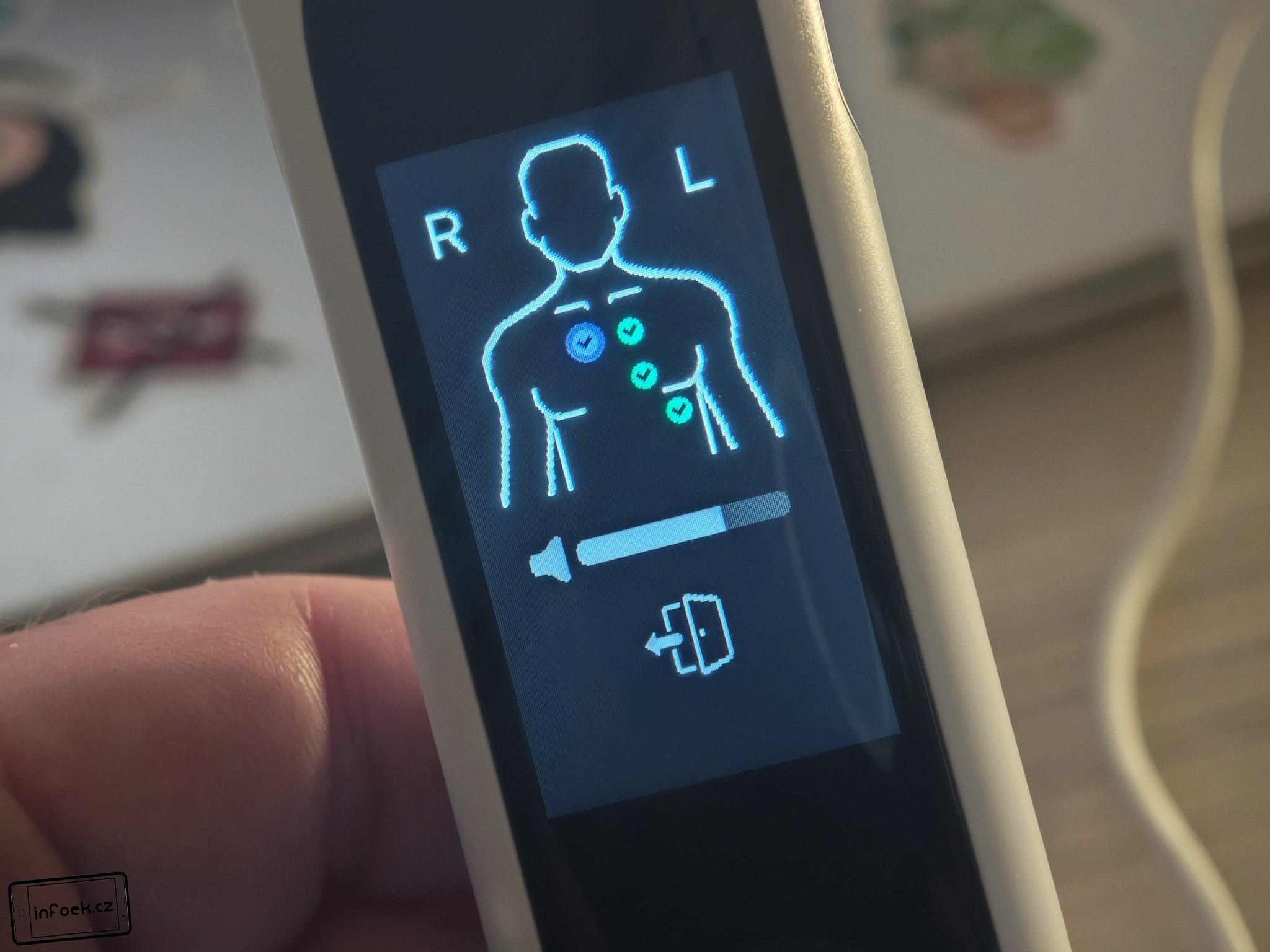 Upřímně jsem od takto kompaktního zařízení nečekal, že zvládne také měření EKG, srdečního tepu a saturace krve (SpO2). Tuto funkci jsem si oblíbil – v menu lze spustit režim ECG/SpO2, přiložit ukazováčky na dvě elektrody na pravé straně zařízení a přitlačit tak, aby kulička na displeji byla ve vyznačeném místě. Během několika sekund získáte hodnoty srdečního tepu, saturace kyslíkem i základní informaci o tom, zda je EKG v pořádku.