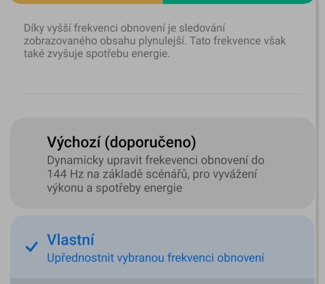 Displej je moderní nejen díky svým minimálním rámečkům a hezky malému průstřelu se selfie kamerkou, ale i navýšením obnovovací frekvence na 144 Hz. V nastavení si můžete vybrat automatické nastavovat frekvence mezi 60 a 144 Hz, ale já si vybral neustále 144 Hz frekvenci. Je totiž strašně příjemná, vše je nádherně svižné a návykové. V nastavení si můžete nastavit také filtr modrého světla (čtecí režim), vybrat jiné písmo i velikost písma.