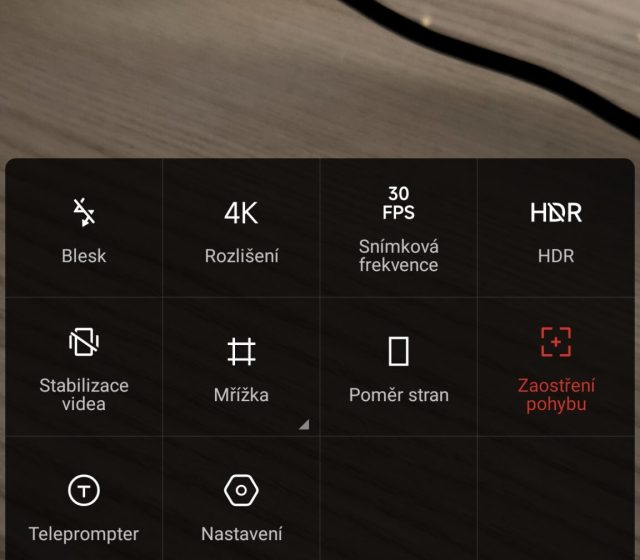 V režimu pro pořizování videí také můžete prstem rozklepnout šipku. Ukrývá nastavení HDR, rozlišení a snímkování, stabilizaci, poměr stran a nechybí ani zaostření pohybu. Pokud chcete natáčet kvalitnější videa pro nějaké publikum, můžete využít teleprompter pro čtená připravených scénářů během natáčení.