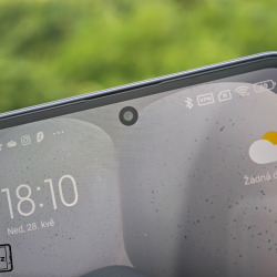 Na skle displeje se nachází od výrobce již nalepená ochranná fólie. Displej má hezky tenké rámečky a chválím malý průstřel selfie kamery uprostřed horní části displeje. Nad displejem se ukrývá výřez s reproduktorem pro hovory.