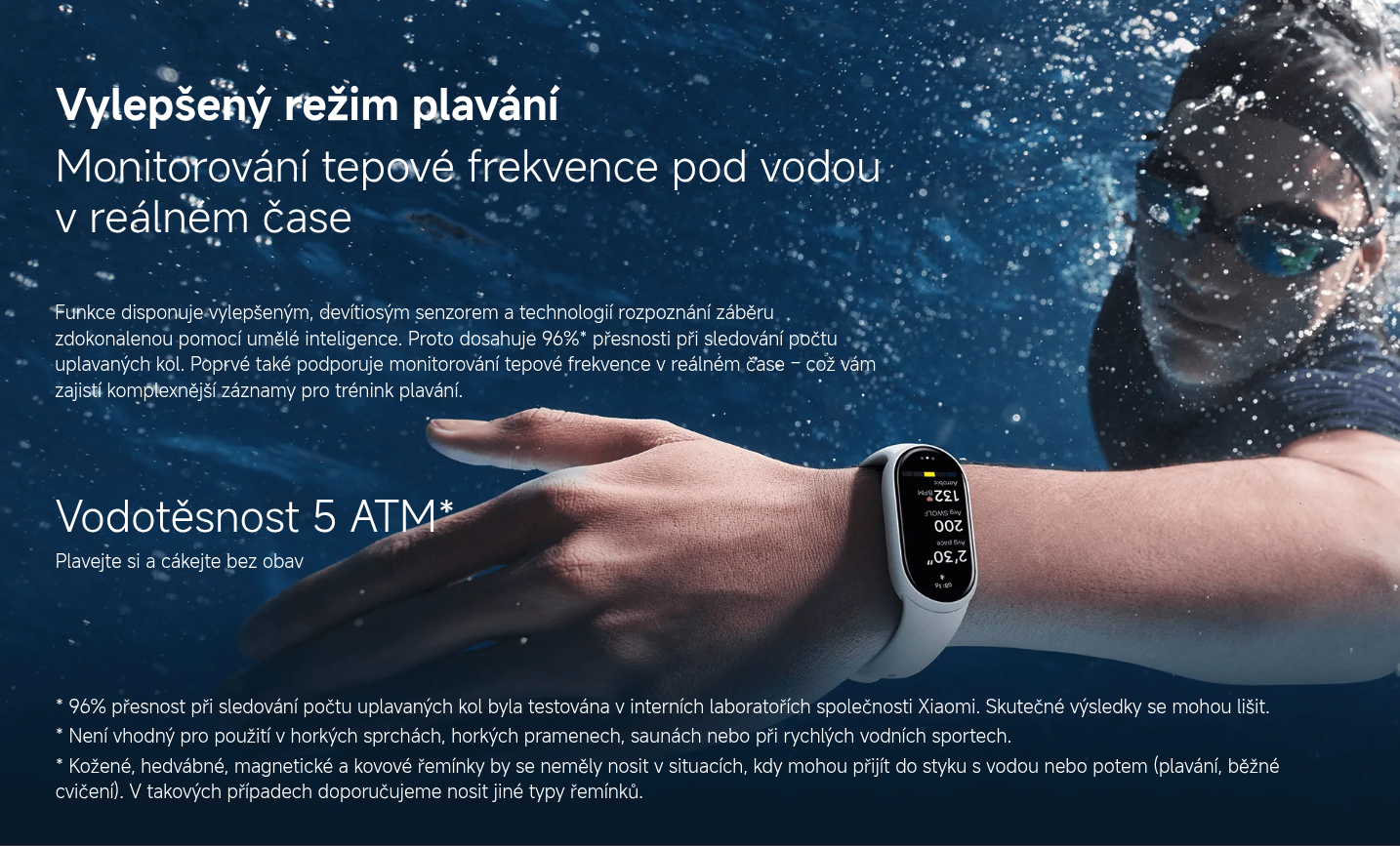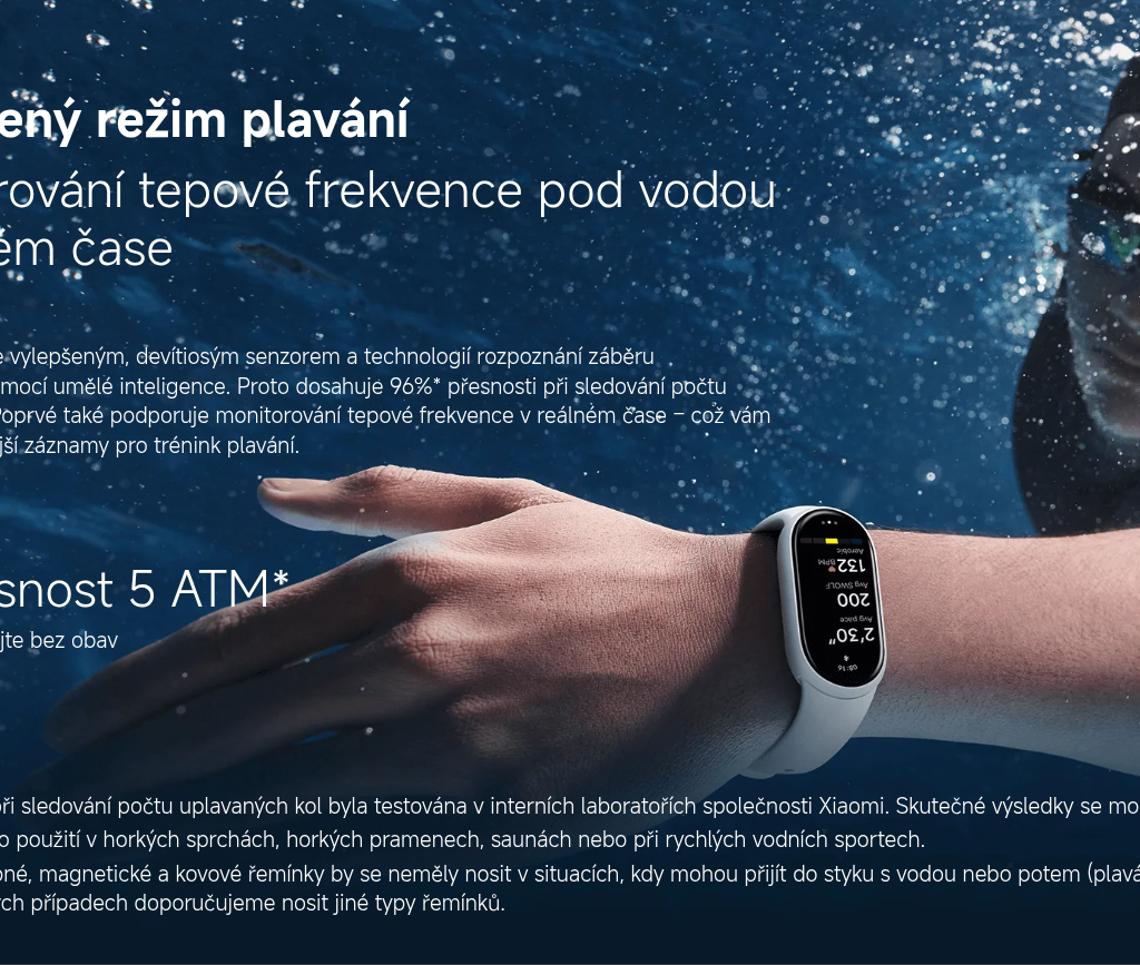 Nebude mu vadit pot? Rozhodně ne. Konstrukce Smart Bandu 10 tradičně splňuje certifikaci odolnosti 5ATM. To znamená, že mu neublíží pot během sportu, plavání ani prašné prostředí.