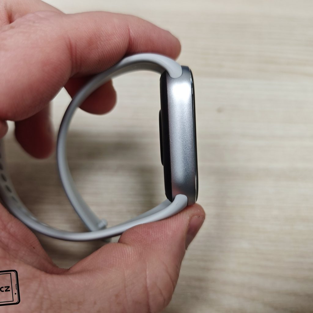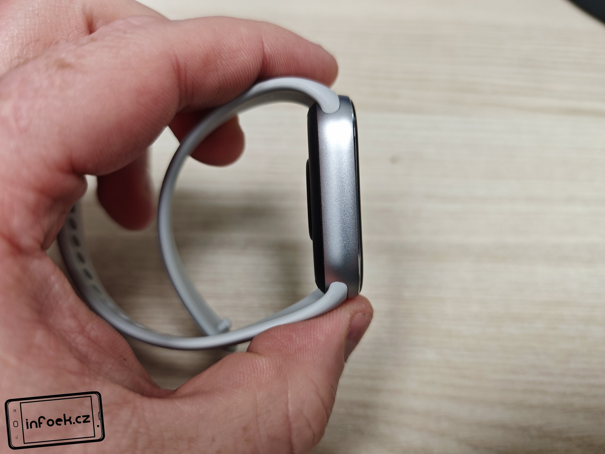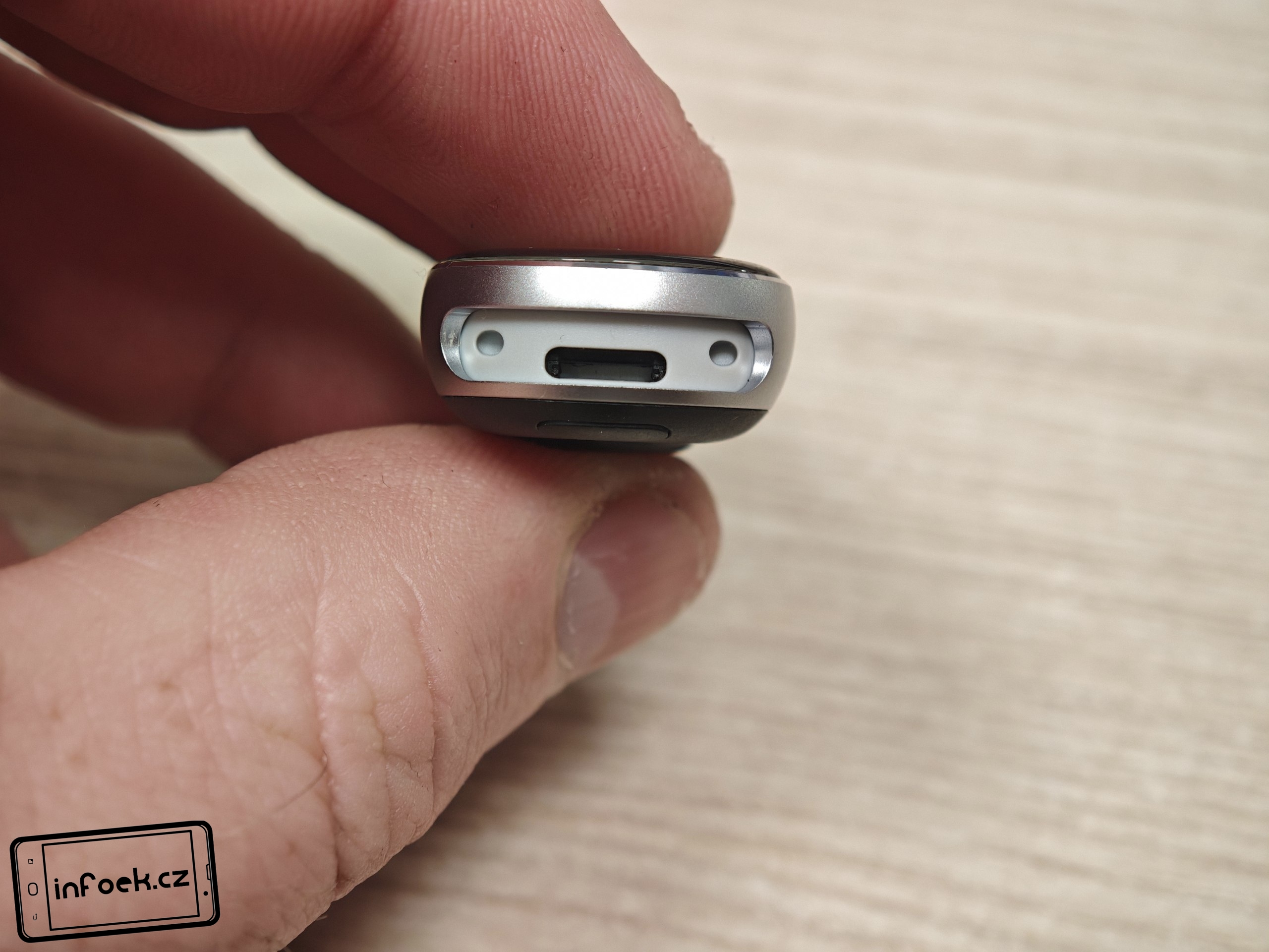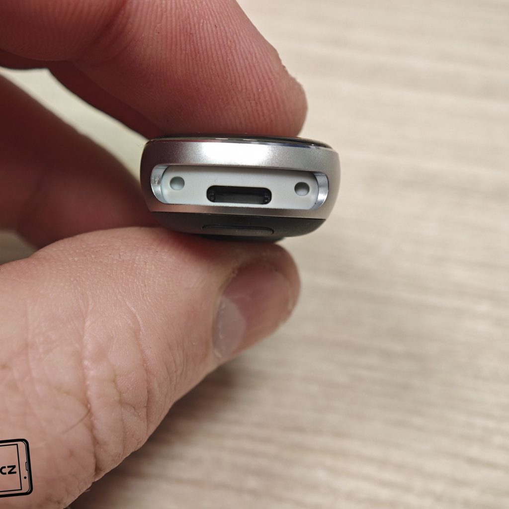 Na čelní ploše najdeme tvrzené sklo displeje s elegantně zaoblenými stranami, které výborně zapadá do hliníkového těla. Na spodní straně se nachází plastová část s lehce vystupujícím modulem se senzory, dvojice nabíjecích pinů a plastová „tlačítka“ pro vyjmutí pásku.