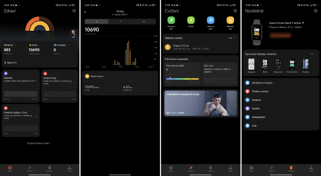 Náramek Smart Band 9 Active si rozumí s oficiální aplikací Mi Fitness. Je dostupná zdarma pro mobily s Androidem a iPhony. Její uživatelské prostředí je kompletně přeloženo do češtiny. Na hlavní obrazovce si položky můžete poskládat vedle sebe, otevírat je a vidět podrobnější informace.