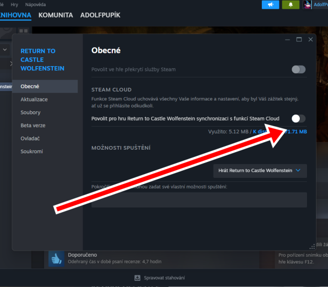 - Vypněte funkci „Povolit pro hru Return to Castle Wolfenstein synchronizaci s funkcí Steam Cloud“