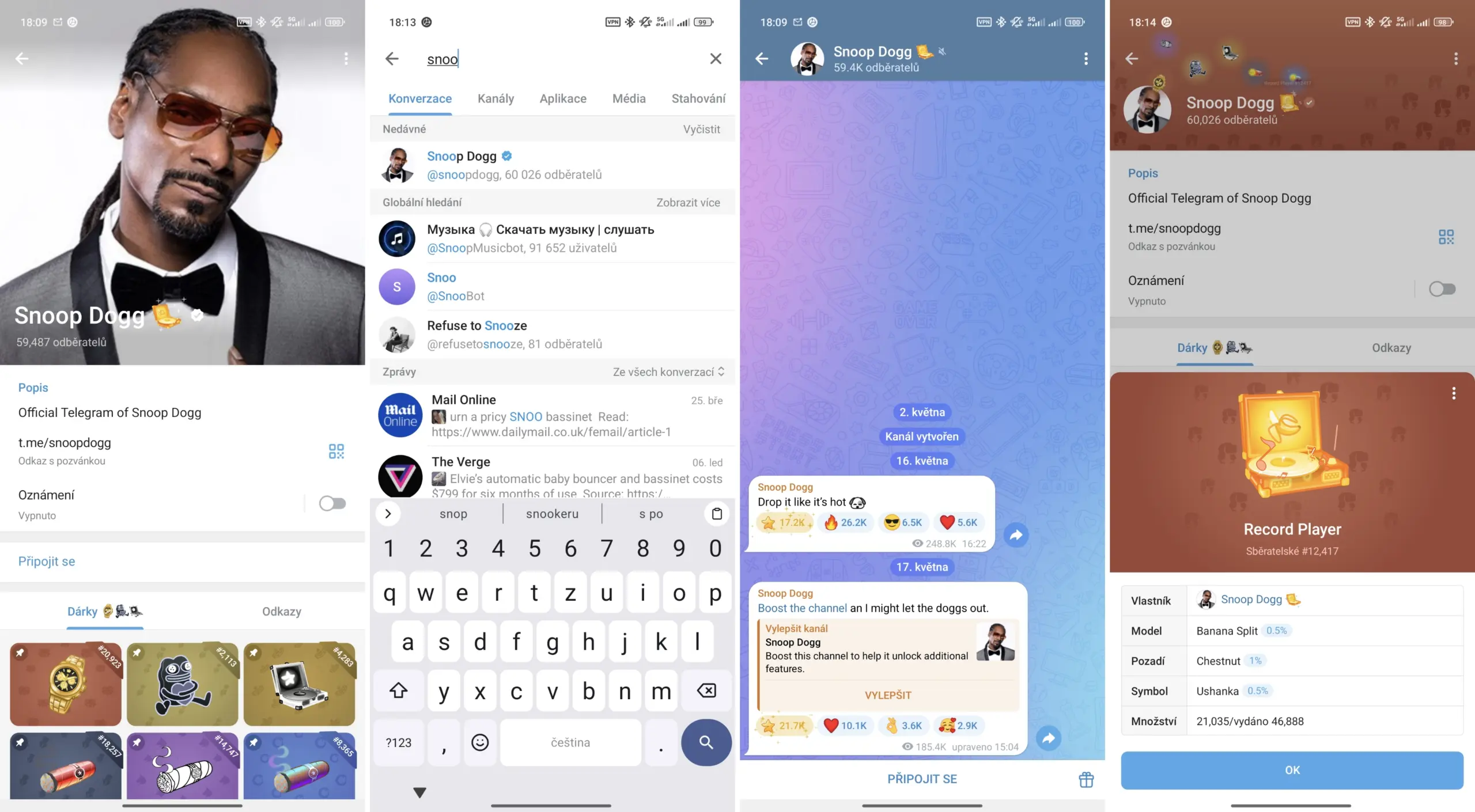 Snoop Dogg si na Telegramu vytvořil veřejný kanál. Nejedná se o falešný účet, jelikož byl profil oficiální cestou ověřený. Nebyl by to Snoop Dogg, kdyby si nepořídil sběratelská NFT. Některé dárky mu zasílají také fanoušci a počet odběratelů jeho kanálu roste.