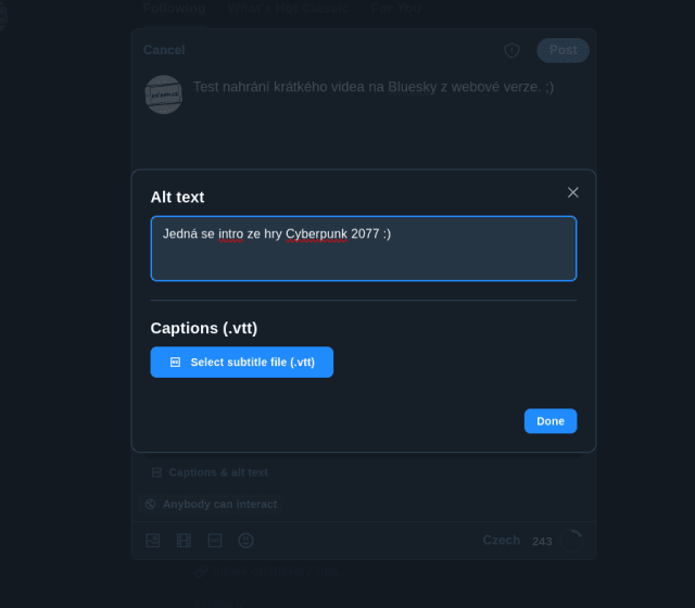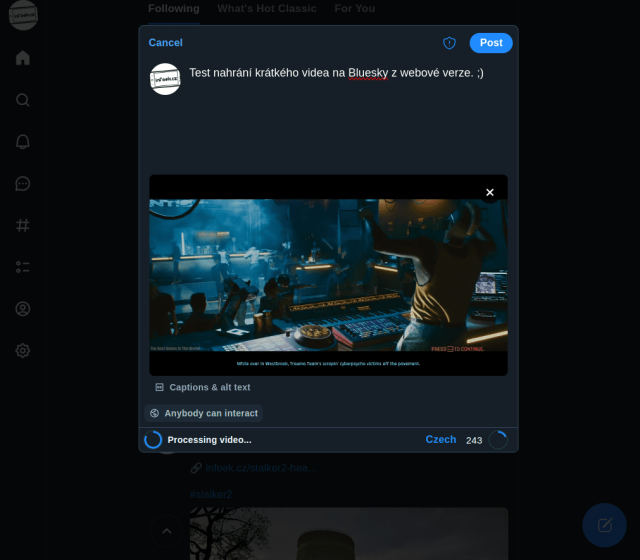 Bluesky se neustále vylepšuje, ale stále postrádá některé funkce. Není to tak dávno, co služba konečně obdržela možnost psát soukromé zprávy a GIF animace. Někomu stále chyběla možnost do příspěvku vkládat alespoň krátká videa. Funkce do Bluesky konečně přichází a funguje nejen na webové verzi, ale také v mobilní aplikaci. Je jen zvláštní, že v době psaní tohoto článku nebyla ještě přístupná všem účtům.
