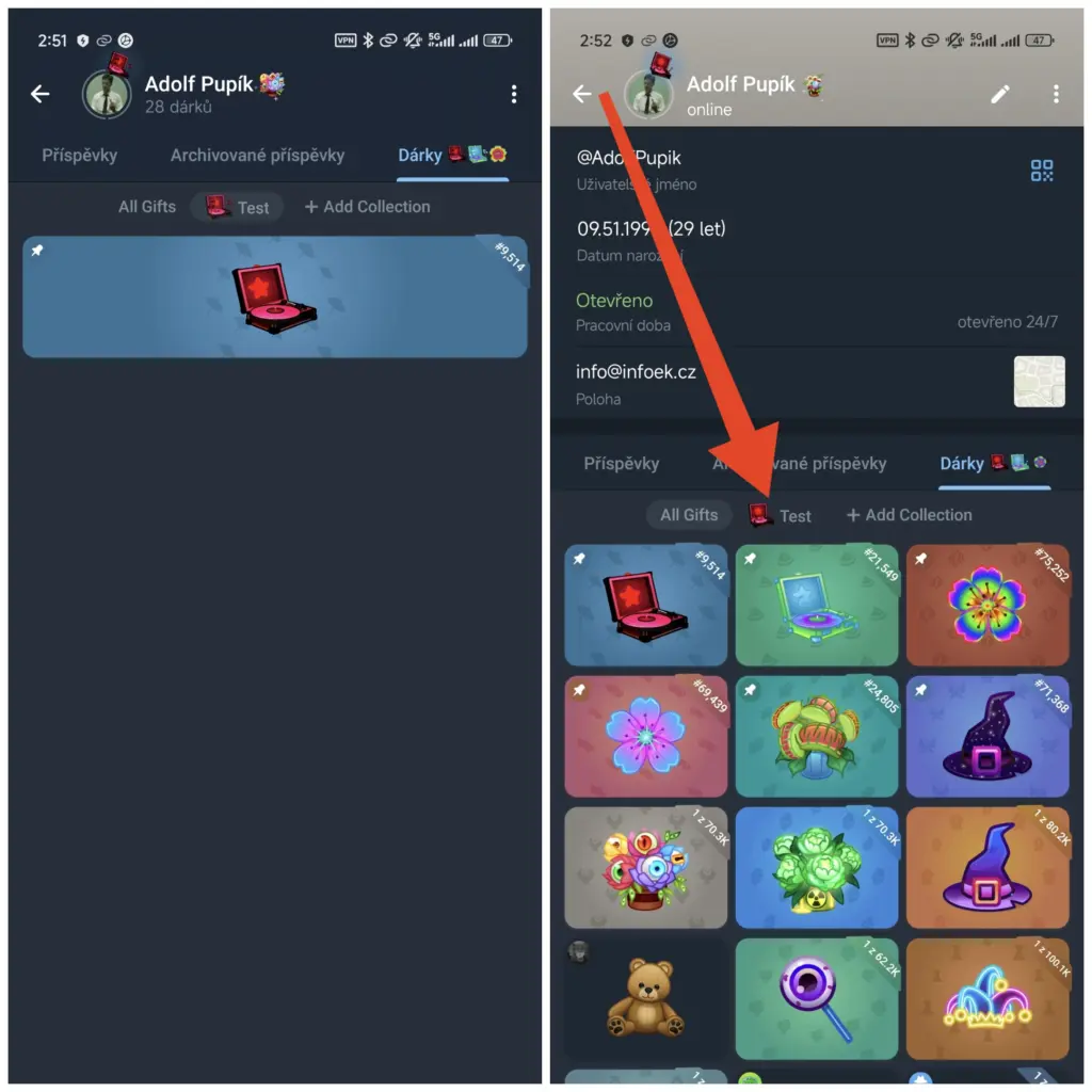 Telegram na funkci dárků neustále pracuje. Beta testeři si je již mohou třídit do svých  kolekcí. Jsou viditelné přímo na profilu a pokud jich vlastníte více, bude jejich hledání nyní rychlejší.