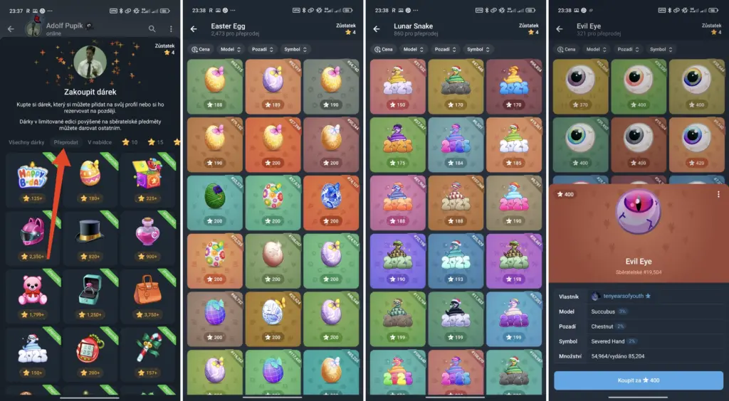 Chcete si koupit NFT dárky za měnu Telegram Stars od ostatních uživatelů? Stačí přejít třeba do: Menu aplikace Telegram, Nastavení, Poslat dárek, Vaše jméno, Přeprodat. Všechny kolekce dárků obsahují další stránku s daným dárkem v různých podobách k zakoupení za Telegram Stars.