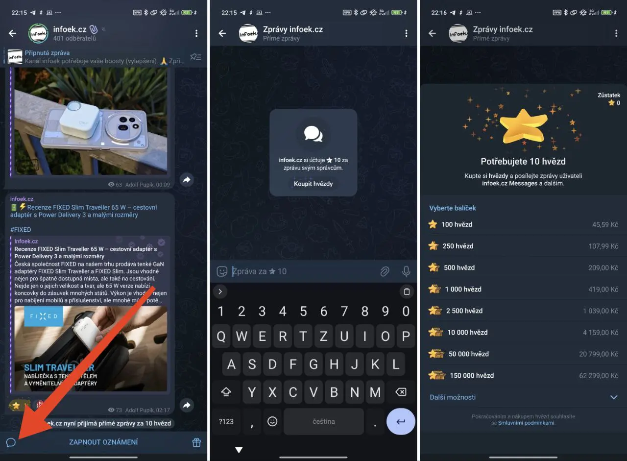 Nová aktualizace přinesla možnost zapnout přímé zasílání zpráv. Zprávy obdrží autor daného kanálu a může si nastavit, aby za každou zprávu obdržel vybraný počet Telegram Stars. Jedná se o měnu v ekosystému Telegramu.