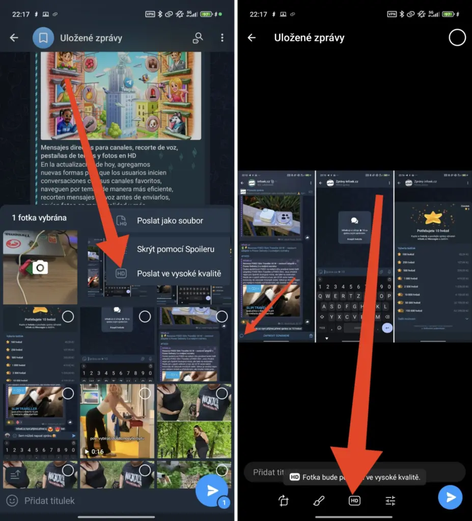 Telegram mnoho let umí posílat fotky s náhledem s kompresí (se snížením rozlišení) nebo jako soubor v původní kvalitě. Co když ale chci odeslat fotku s náhledem ve vyšším rozlišení? Nyní to je možné. Stačí před odesláním vybrat možnost „HD“ nebo „Poslat ve vysoké kvalitě“. Nebude se sice jednat o původní kvalitu fotky, ale rozlišení skutečně větší je.
