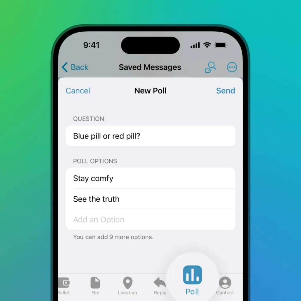 Nová aktualizace přináší lepší práci s anketami. Telegram jejich vytváření a hlasování umí od roku 2018, ale nyní lze nastavit až 12 možností, uložit výsledky do záložek pro budoucí využití a uložit si ankety do uložených zpráv.