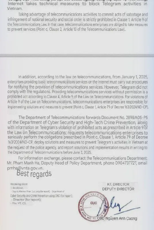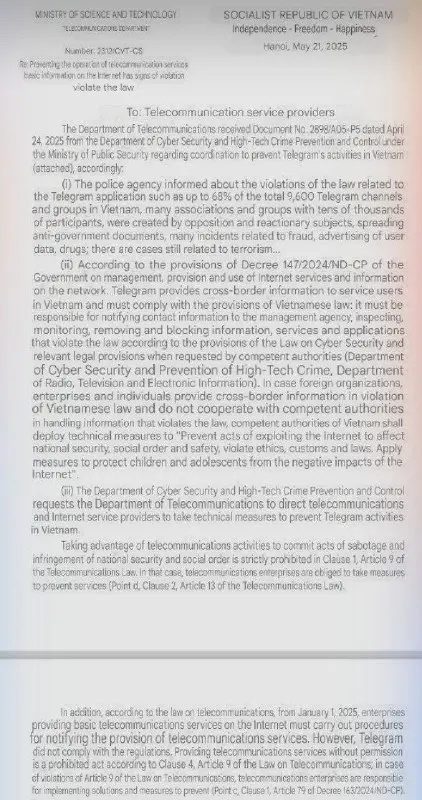 V uzavřených komunitách v Telegramu se objevují dokumenty, které tvrdí, že vietnamské Ministerstvo pro technologie nařídilo poskytovatelům telekomunikačních služeb zablokování Telegramu. Později se tato informace potvrdila. Telegram s tamními úřady údajně nespolupracuje v boji proti údajným trestným činům svých uživatelů.