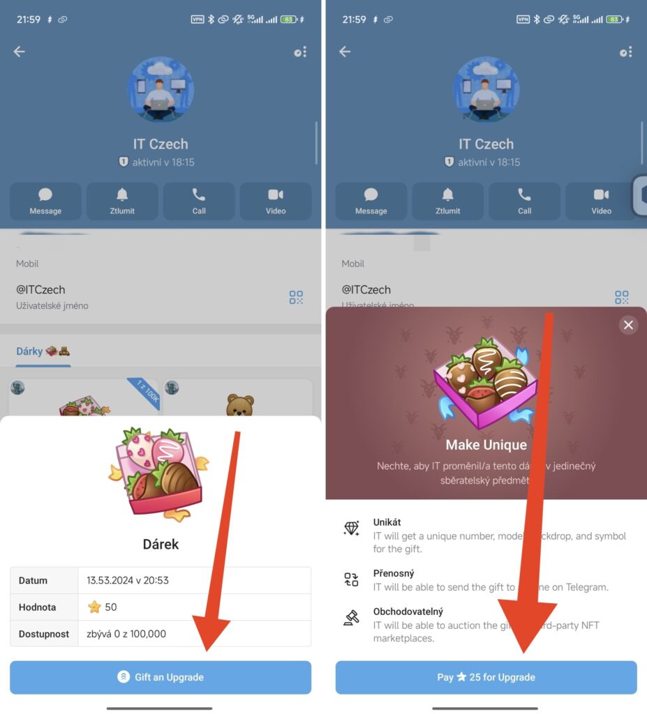Stačí navštívit profil daného uživatele, přejít do sekce „Dárky“ a limitované dárky upgradovat na NFT. Samozřejmě to není zdarma, poplatek je účtován v podobě Telegram Stars. Cena se může lišit podle hodnoty dárku, ale nejčastěji jsem narazil na poplatek 25 Telegram Stars.