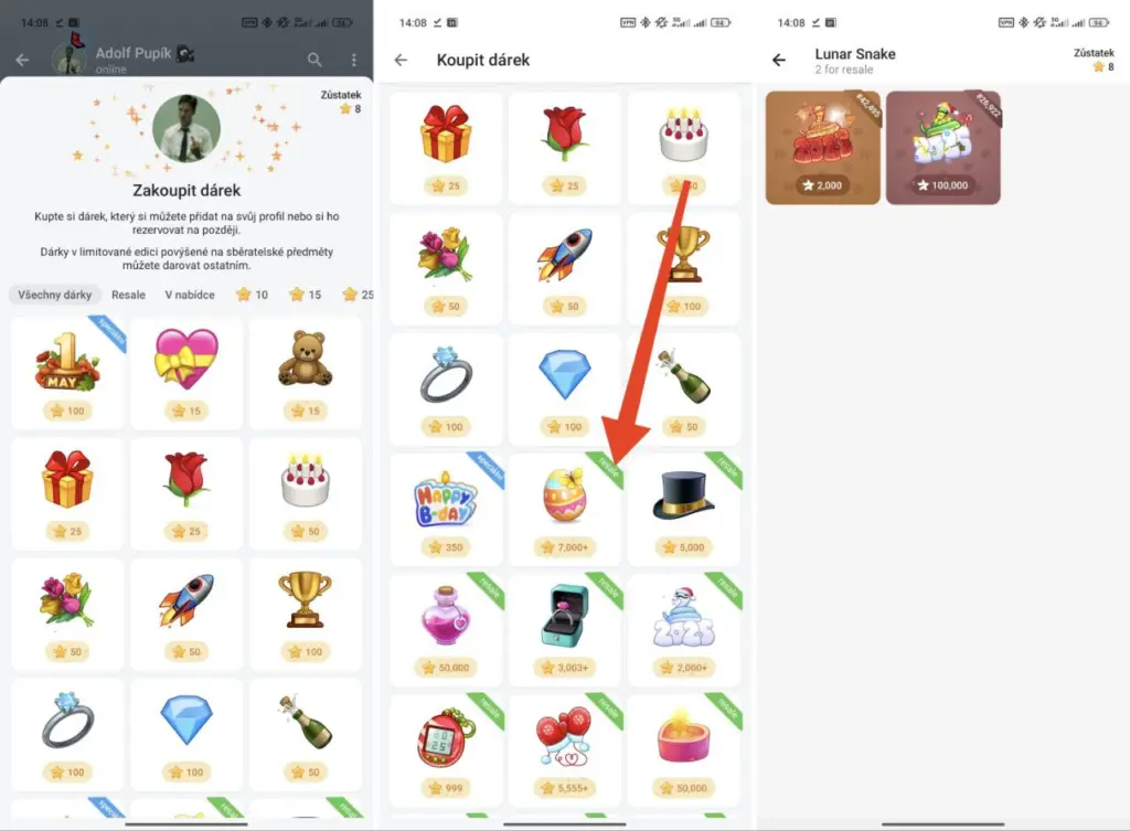 Limitované NFT dárky v prodeji od dalších uživatelů najdete v: Menu aplikace Telegram, Nastavení, Poslat dárek, Zakupte si dárek. U dárků najdete nápis „Resale“ v zeleném proužku. nabízené dárky si můžete prohlédnout a koupit.