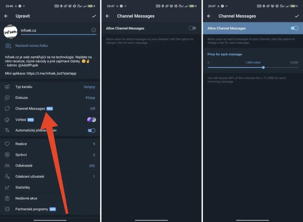 Majitelé skupin mohou delší dobu využívat zpoplatněné psaní zpráv za měnu Telegram Stars. Skupinu bylo možné propojit s kanálem a využívat tak komentování příspěvků za měnu Stars, což bylo pro mnoho uživatelů matoucí. To se nyní může měnit a majitel kanálů může zapnout psaní zpráv za libovolnou cenu Telegram Stars.