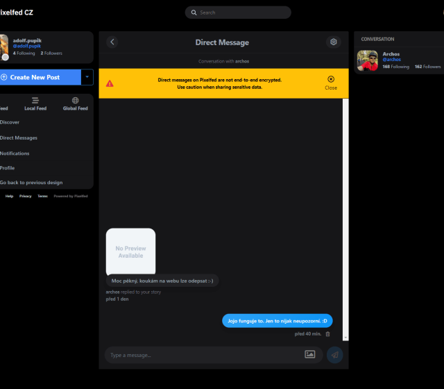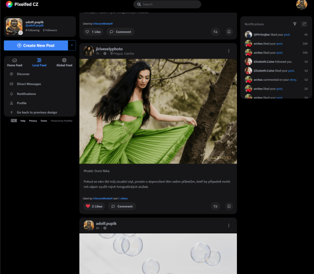 Webová verze Pixelfed instancí byla vždy propracovaná a měla nejvíce funkcí. Vypadá vážně skvěle a její prostředí je přehledné. Tady vývojář dost zapracoval a sdílet lze v jeden den více fotek do stories, přidávat příspěvky do feedu, sledovat obsah ostatních a vlastně vše potřebné je k dispozici. Již taky fungují soukromé zprávy pro komunikaci s ostatními a vytvořit můžete i pěkné portfolio. To lze někomu nasdílet odkazem.