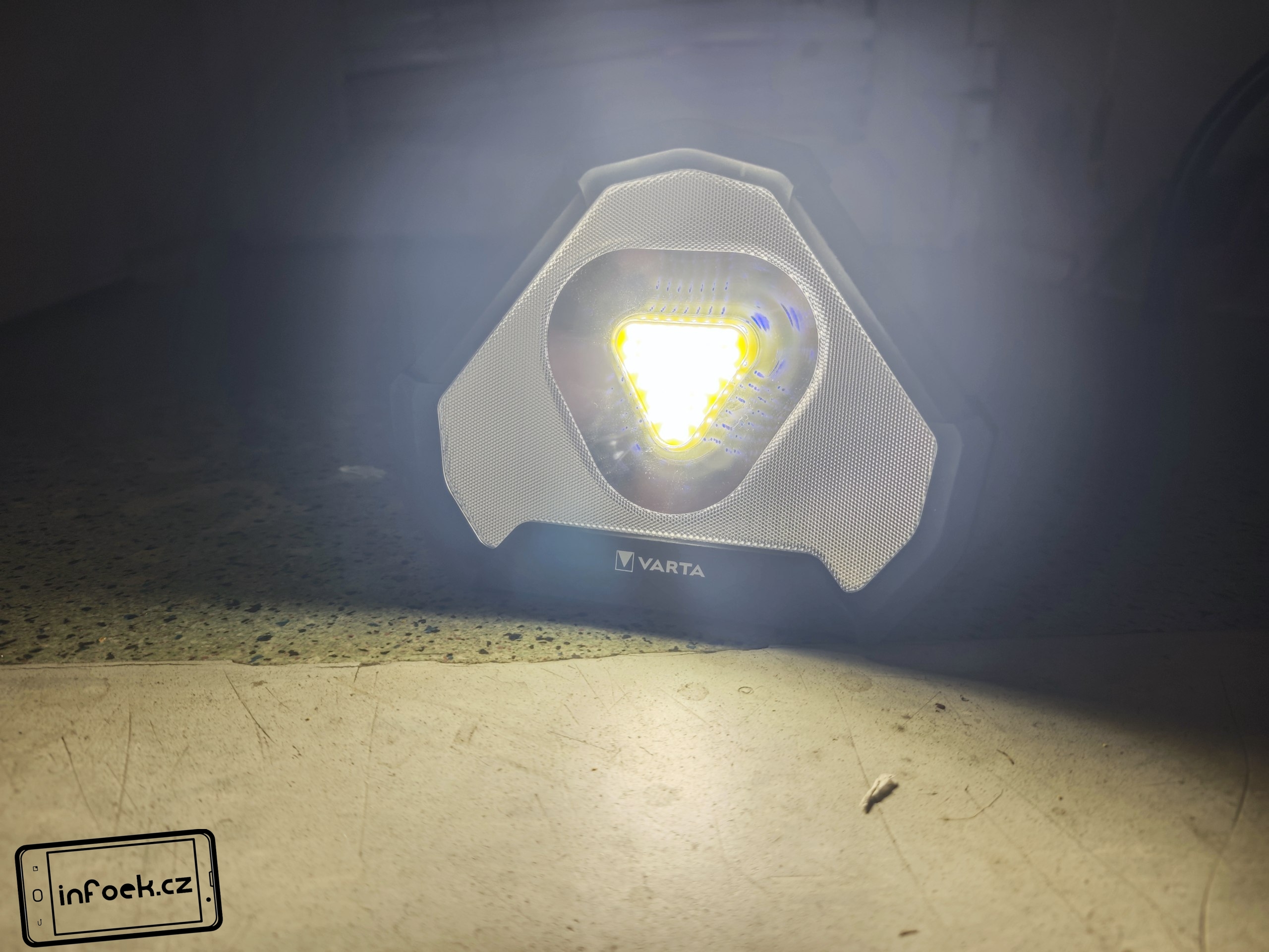 VARTA Work Flex Stadium Light se chlubí výkonným LED COB modulem. Svítilna dosahuje maximálníhi svitu až 1 450 lm, přičemž intenzitu lze jednoduše přepínat modrým tlačítkem. K dispozici jsou tři úrovně svítivosti. Všechny režimy jsou dostatečně silné, přičemž na maximální výkon je světlo opravdu velmi intenzivní – rozhodně nedoporučuji mířit jím přímo do očí. Výrobce uvádí dosvit až 45 metrů, což odpovídá realitě.