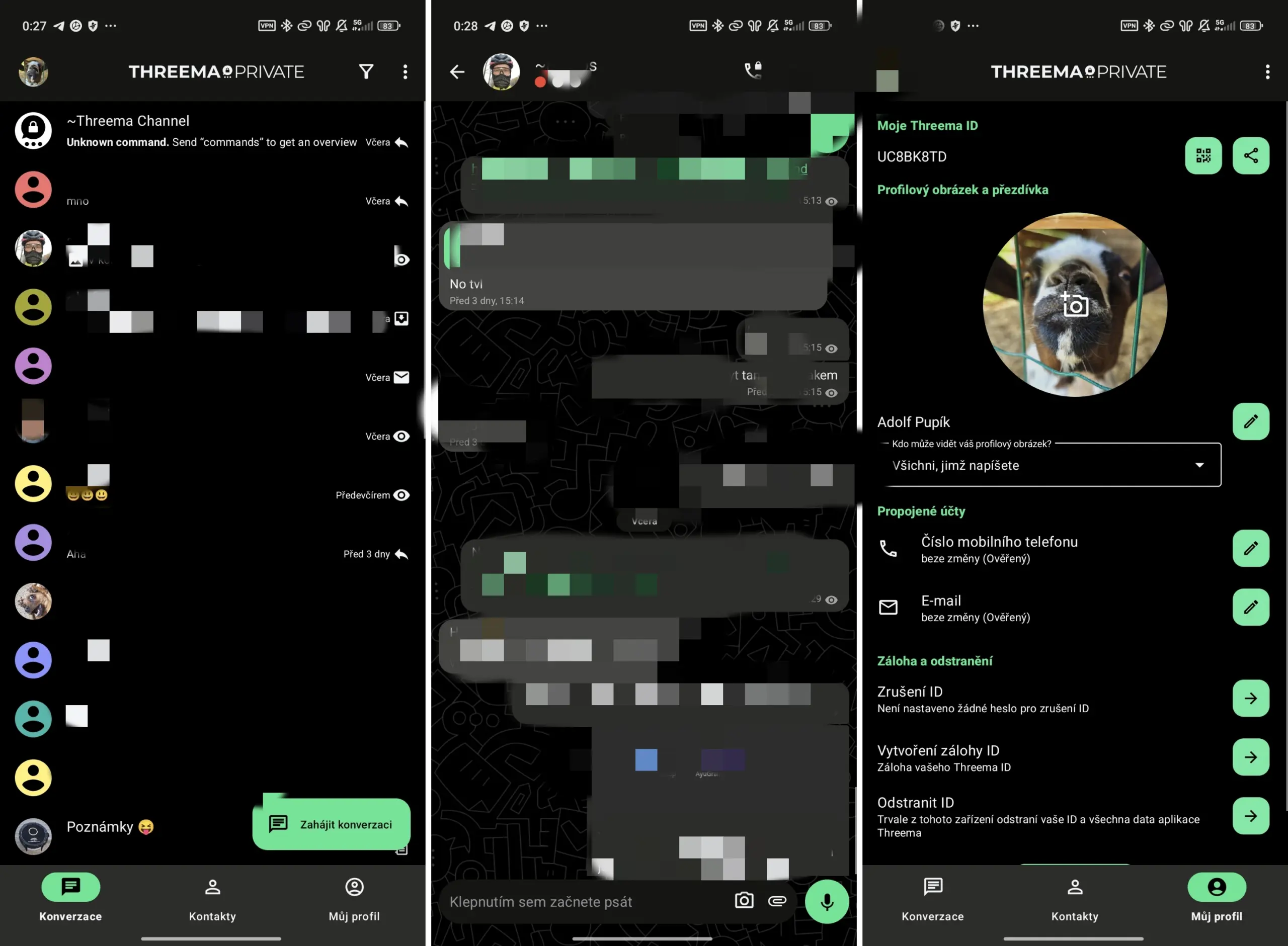 Nová verze v6.1.0 na první pohled nepřinesla nic nového. Ve skutečnosti na horní části má nové logo Threema Private, což je nové značení aplikací Threemy pro běžné uživatele. Existují totiž ještě další dvě aplikace, ale ty jsou určeny pro podniky. Nejedná se o jedinou změnu, ale na některých mobilech je znatelně rychlejší spouštění aplikace, funguje mnohem lépe černý motiv pro OLED displeje, dynamické systémové barvy se umí promítnout do Threemy na dalších mobilech a plynulejší jsou animace. Jedná se tedy o malé, přesto užitečné a příjemné změny k lepšímu.