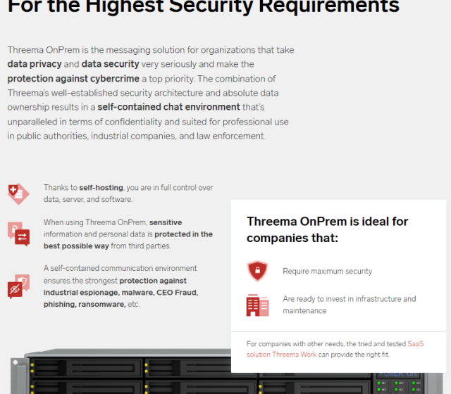 Threema OnPrem je řešení pro zasílání zpráv pro organizace, které berou soukromí a bezpečnost dat velmi vážně a pro které je ochrana před kybernetickou kriminalitou nejvyšší prioritou. Výsledkem kombinace dobře zavedené bezpečnostní architektury Threema a absolutního vlastnictví dat je samostatné chatovací prostředí, které je z hlediska důvěrnosti bezkonkurenční a vhodné pro profesionální použití v orgánech veřejné správy, průmyslových podnicích a orgánech činných v trestním řízení. – Threema
