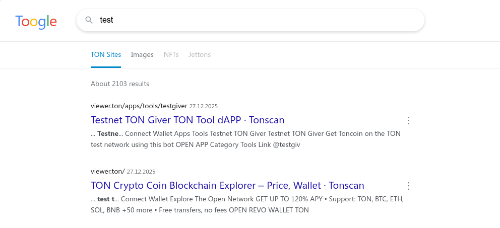 Toogle na první pohled připomíná vyhledávač jako Google a zobrazuje stránky i obrázky. Časem by se měl naučit pracovat s NFT a Jettons. Byl spuštěn nedávno a postupně se bude zlepšovat.