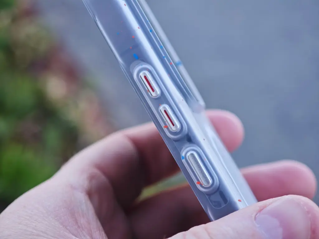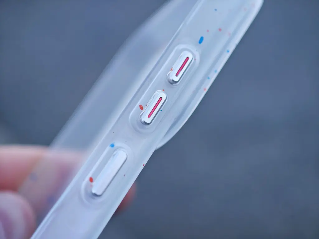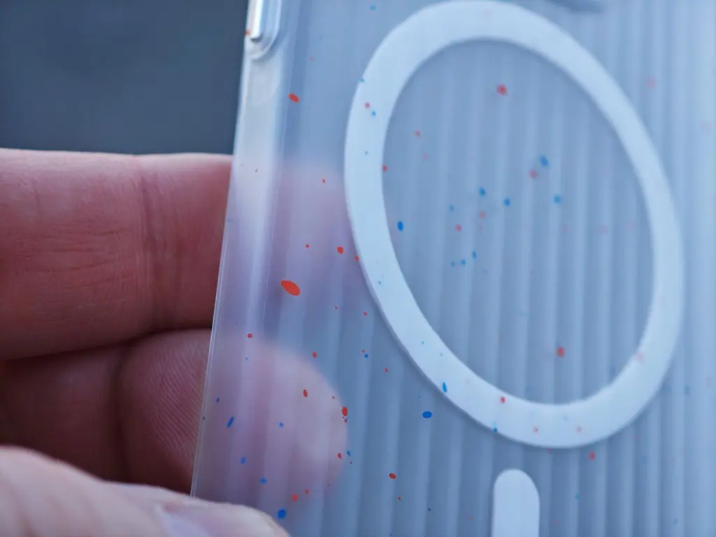 Další kryt se mi líbí asi nejvíce. Je průhledný, můžeme v něm vidět magnetický kroužek pro uchycení příslušenství a decentní barevné tečky. Červeně zvýrazněna jsou tlačítka pro regulaci hlasitosti, a to opět jen decentně. Nic tedy nekřičí barvami a jelikož se jedná o kvalitní plast, neměl by kryt časem žloutnout. Ona je jeho povrchová úprava vydařená a zadní část je vlnitá. Kryt je po všech stranách tenký, nechybí mu důležité výřezy a má lehce vystupující části kolem modulu s fotoaparáty a kolem displeje.