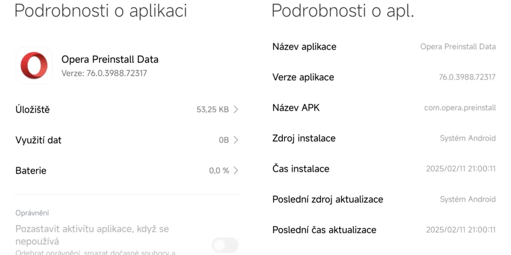 Tím to ale nekončí, jelikož po různých aktualizacích se v mobilech začala objevovat mobilní aplikace Opera Preinstall Data a internetový prohlížeč Opera. Obě tyto aplikace se předinstalovávají bez souhlasu. Po instalaci prohlížeče v mobilu stále zůstává druhá aplikace, což je podezřelé. Tyto aplikace se objeví aktualizací Androidu. V současné době je můžete bez ADB a jiných složitějších zásahů odinstalovat.