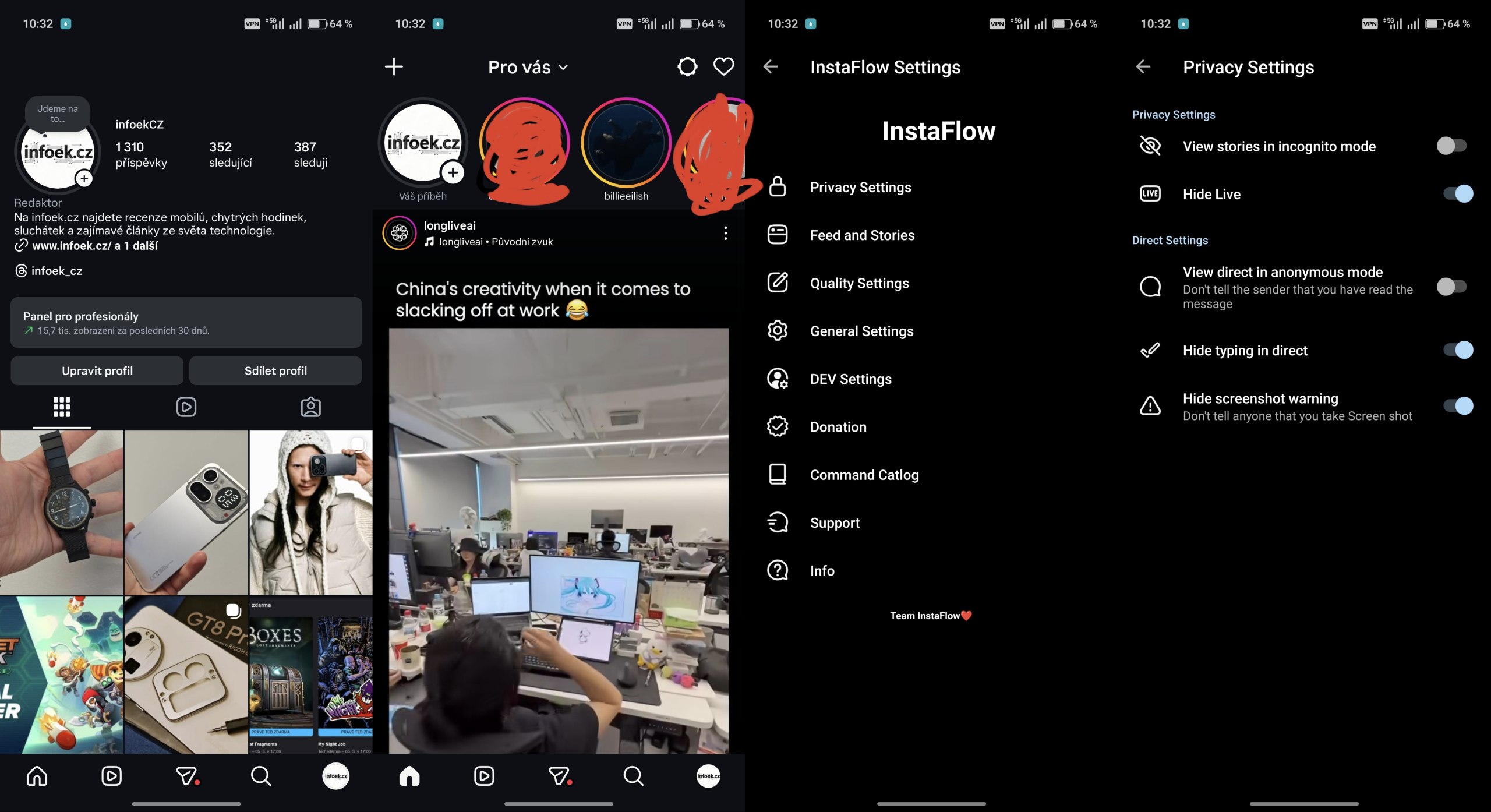 Nečekejte však žádné zásadní změny. Aplikace je založena na novější verzi oficiálního klienta, ale odstraňuje veškeré reklamy a otravné funkce Meta AI. Dále opravuje občasné problémy se stahováním videí a fotek, eliminuje nutnost sdílet seznam kontaktů a blokuje různé sledovací prvky společnosti Meta. V horní části aplikace stále najdete ikonu ozubeného kola nabízející různé funkce, jako je skrytí indikace psaní v chatu, odstranění živých vysílání, povolení vyšší kvality médií a další užitečné možnosti.