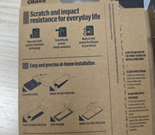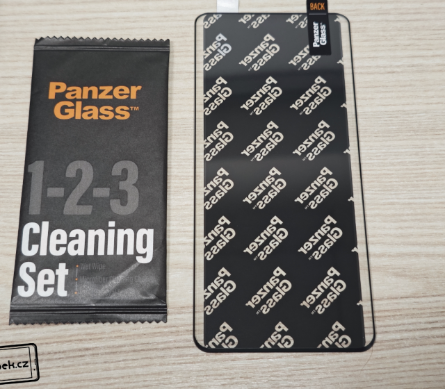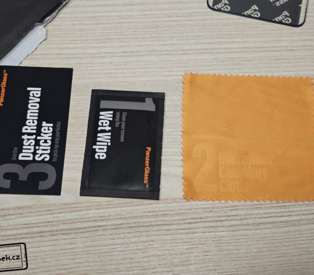 Dánský výrobce PanzerGlass chce jít cestou udržitelnosti a prodejní balení obsahuje minimum plastu. Uvnitř krabičky se nachází jen sklo a sáček se vším potřebným – vlhčený hadřík, suchý hadřík a lepenka pro odstranění prachu. Lepení na displej mobilu je velmi jednoduché a celý postup najdete znázorněný přímo na krabičce.