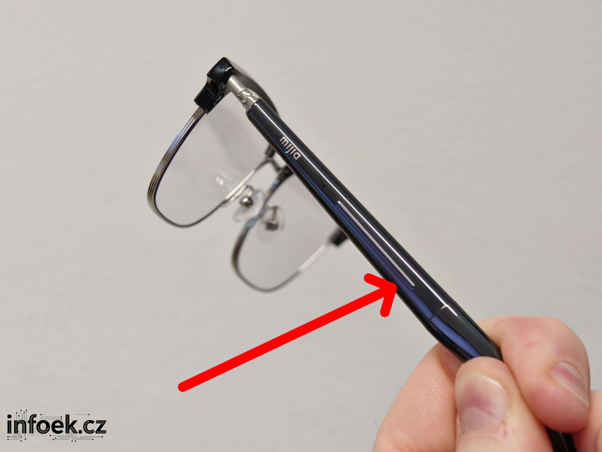 - Brýle mají po obou stranách nožiček dotykovou plochu, která umožňuje vyžívat více funkcí. Režim párování vyvoláte tak, že na konci dotykové plochy (konec výraznější čáry) dlouze podržíte. Měl by zaznít zvuk, a ten indikuje aktivaci párovacího režimu.
