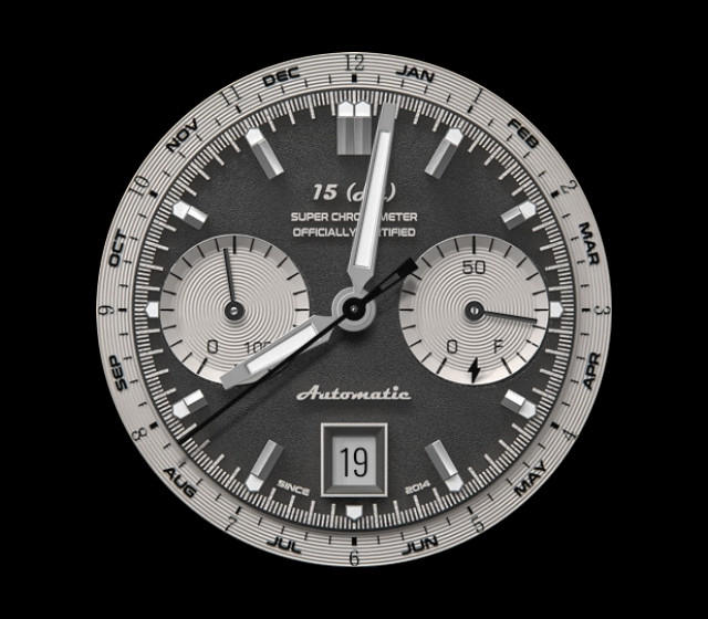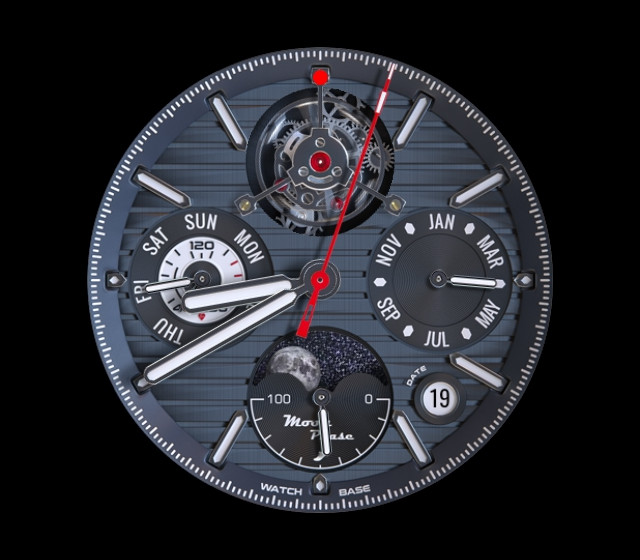 Další elegantní ciferník s datumovkou. Upravit můžete barvu pozadí, vteřinovou ručičku a nahoře je možné zapnout turbínu s pohyblivými částmi.