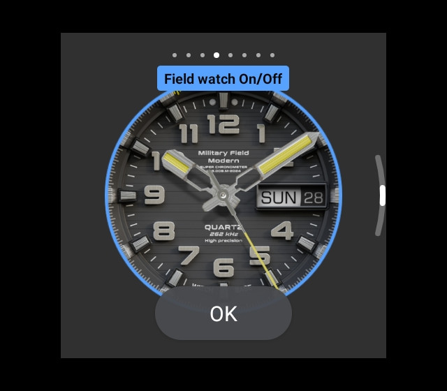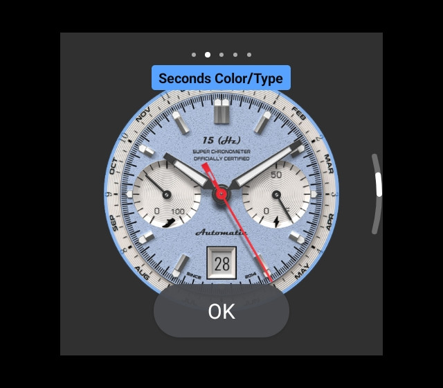 Sportovnější, přesto elegantní ciferník. Nechybí datumovka, pěkná tmavá obrazovka Always-On (Aktivní displej). V úpravách je široká možnost upravení vzhledu ciferníku a nastavení komplikací.