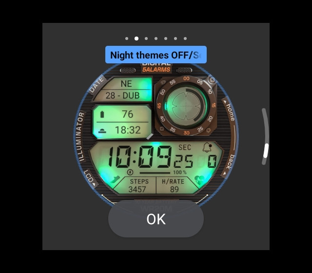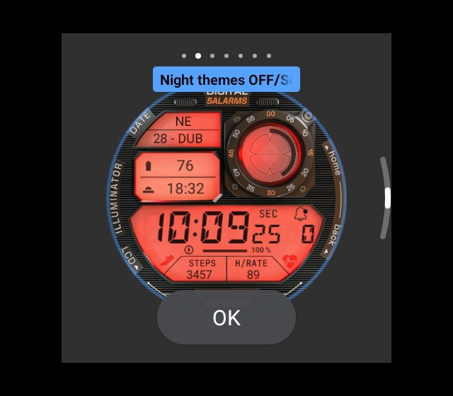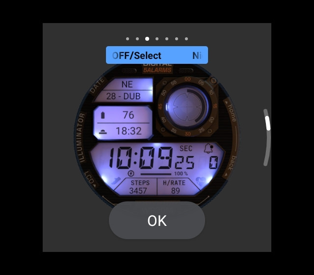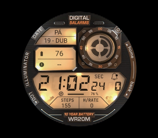 V portfoliu má vývojář i tento digitální ciferník. Je přehledný a zobrazuje veškeré podstatné prvky. Nechybí čas, datum, procenta nabití, srdeční tep nebo třeba počet kroků. Líbí se mi, že lze upravit barvu podsvícení a celý ciferník má díky němu své kouzlo.